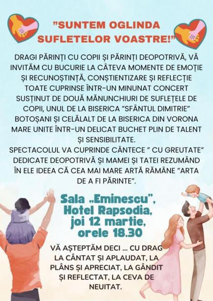 În intervalul orar 18.30-20.00, va avea loc concertul „Suntem oglinda sufletelor voastre”, un eveniment cultural-misionar dedicat părinților și copiilor, organizat de Parohia „Sfântul Dumitru” Botoșani, în parteneriat cu Protopopiatul Botoșani, și care va avea loc în Sala „Eminescu” din cadrul Hotelului Rapsodia.